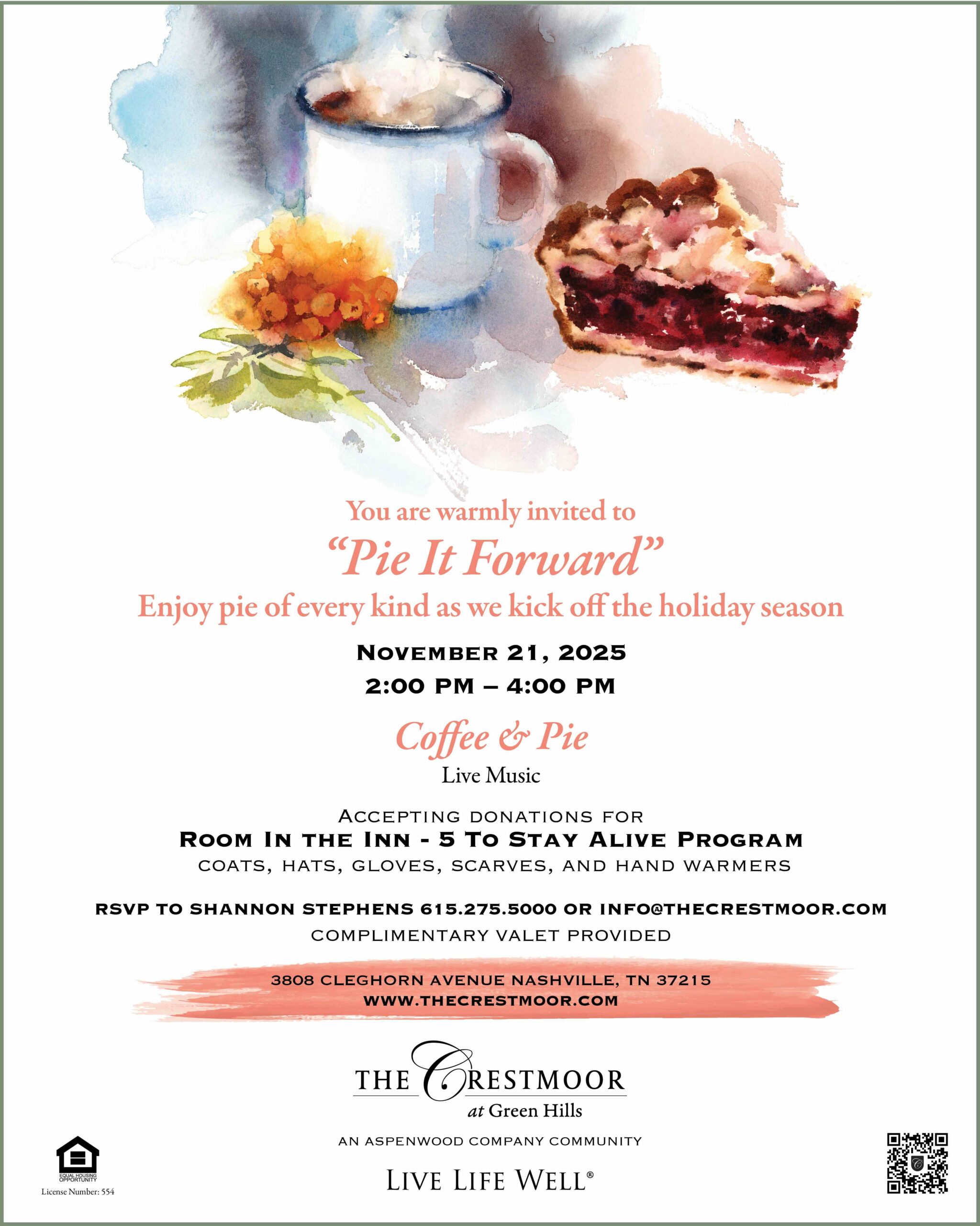 You are warmly invited to "Pie It Forward" NOVEMBER 21, 2025 2:00 PM - 4:00 PM RSVP TO SHANNON STEPHENS 615.275.5000 OR INFO@THECRESTMOOR.COM