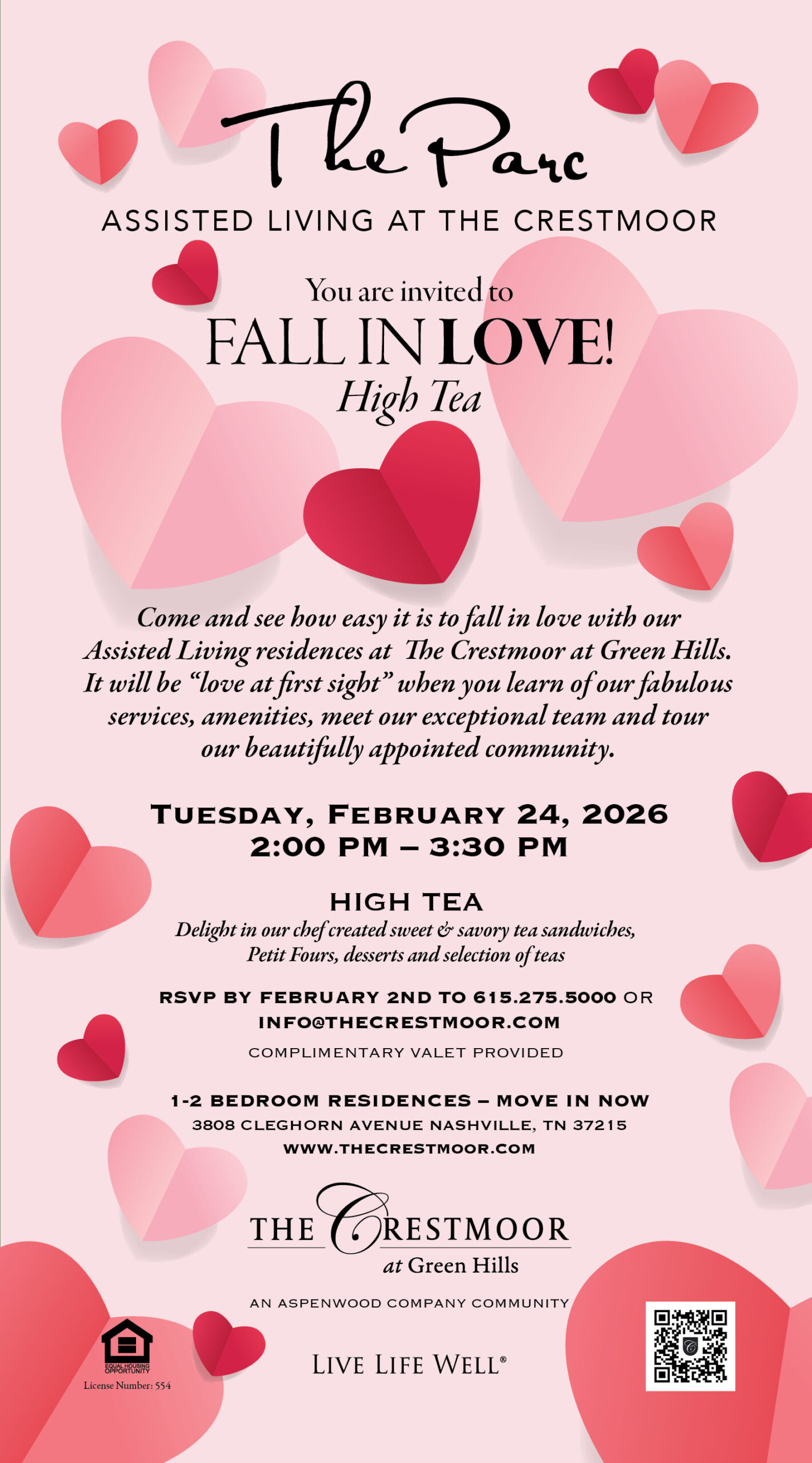 FALL IN LOVE – High Tea February 24 @ 2:00 pm - 3:30 pm The Crestmoor at Green Hills 3808 Cleghorn Avenue, Nashville, TN, United States TUESDAY, FEBRUARY 24, 2026 2:00 PM - 3:30 PM RSVP by February 2nd to 615.275.5000 or info@thecrestmoor.com
